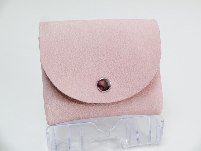 手のひらサイズで、ポケットからさっと取り出せる。 ちょっと近所にお買い物するのに便利です。 柔らかい革を使い、ぷっくらとしたポーチタイプ。 外蓋と内蓋があり、バネホックで留まります。 外蓋を開けると、カードが収納出来るポケットが一つあります。 内蓋を開けると、コインが収納出来るポケットが一つあります。 内側には、豚革のスウェードを張りました。 色:淡紅梅色(外側)、キャメル(内側)、ホワイト(糸) 大きさ:100mm×86mm×20mm 重さ:36.5g