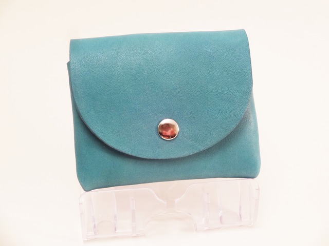 手のひらサイズで、ポケットからさっと取り出せる。 ちょっと近所にお買い物するのに便利です。 柔らかい革を使い、ぷっくらとしたポーチタイプ。 外蓋と内蓋があり、バネホックで留まります。 外蓋を開けると、カードが収納出来るポケットが一つあります。 内蓋を開けると、コインが収納出来るポケットが一つあります。 内側には、豚革のスウェードを張りました。 色:セルシアンブルー(外側)、キャメル(内側)、スカイブルー(糸) 大きさ:100mm×86mm×20mm 重さ:39.5g