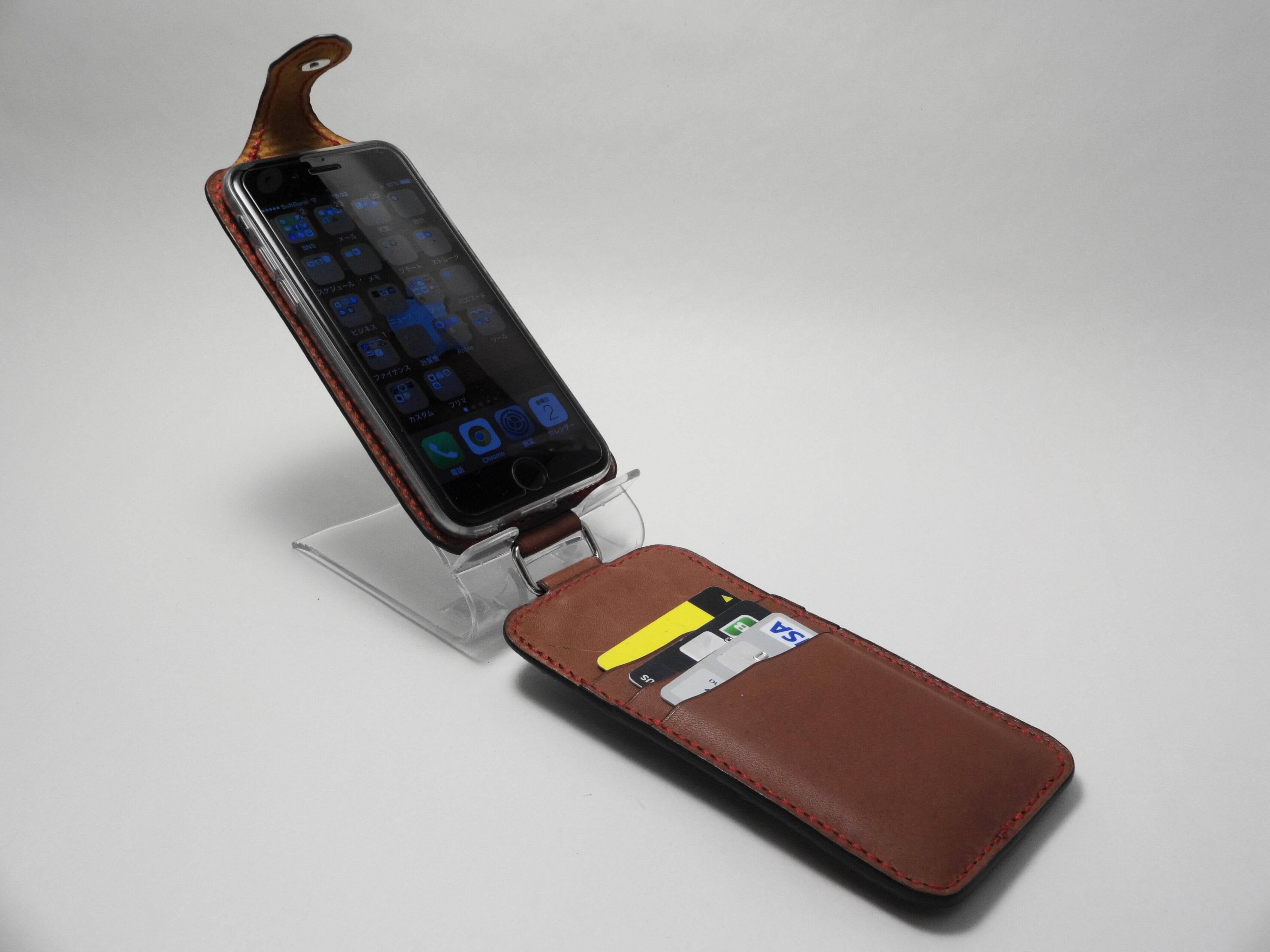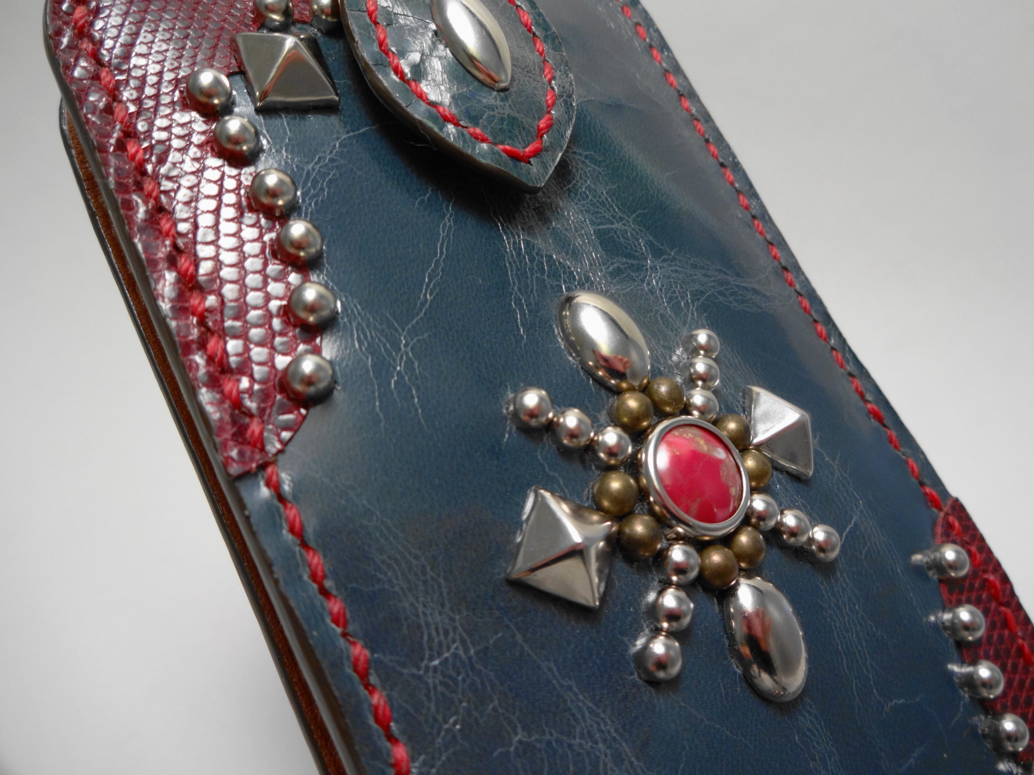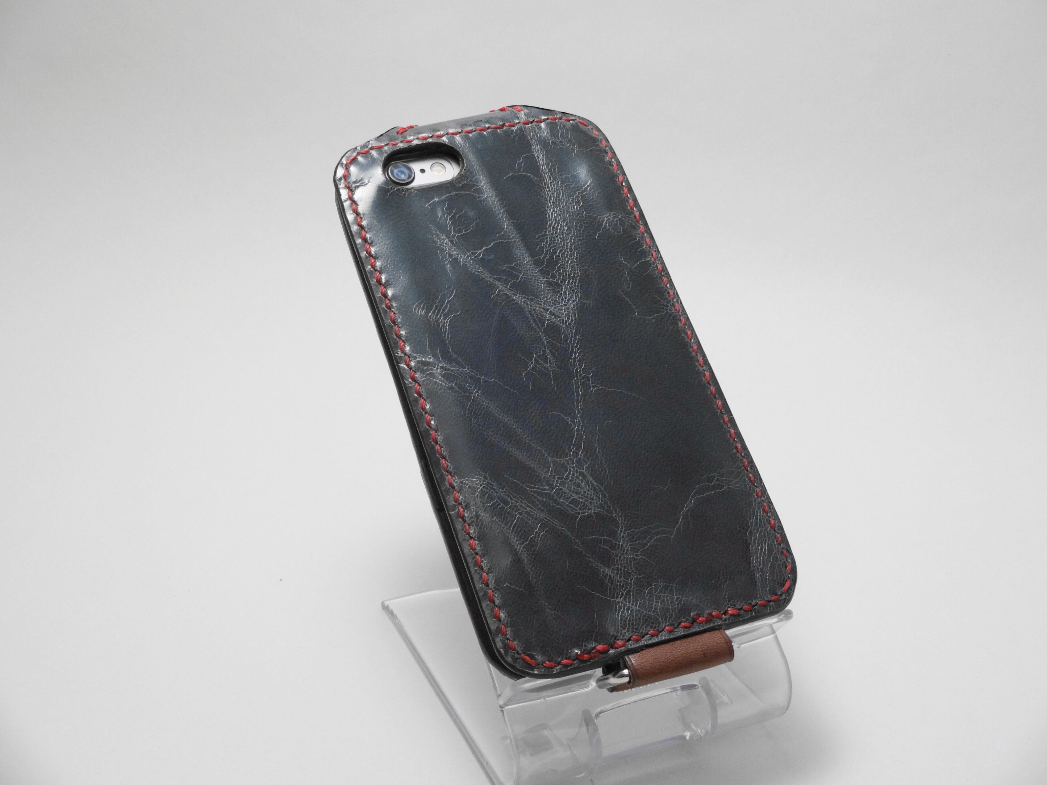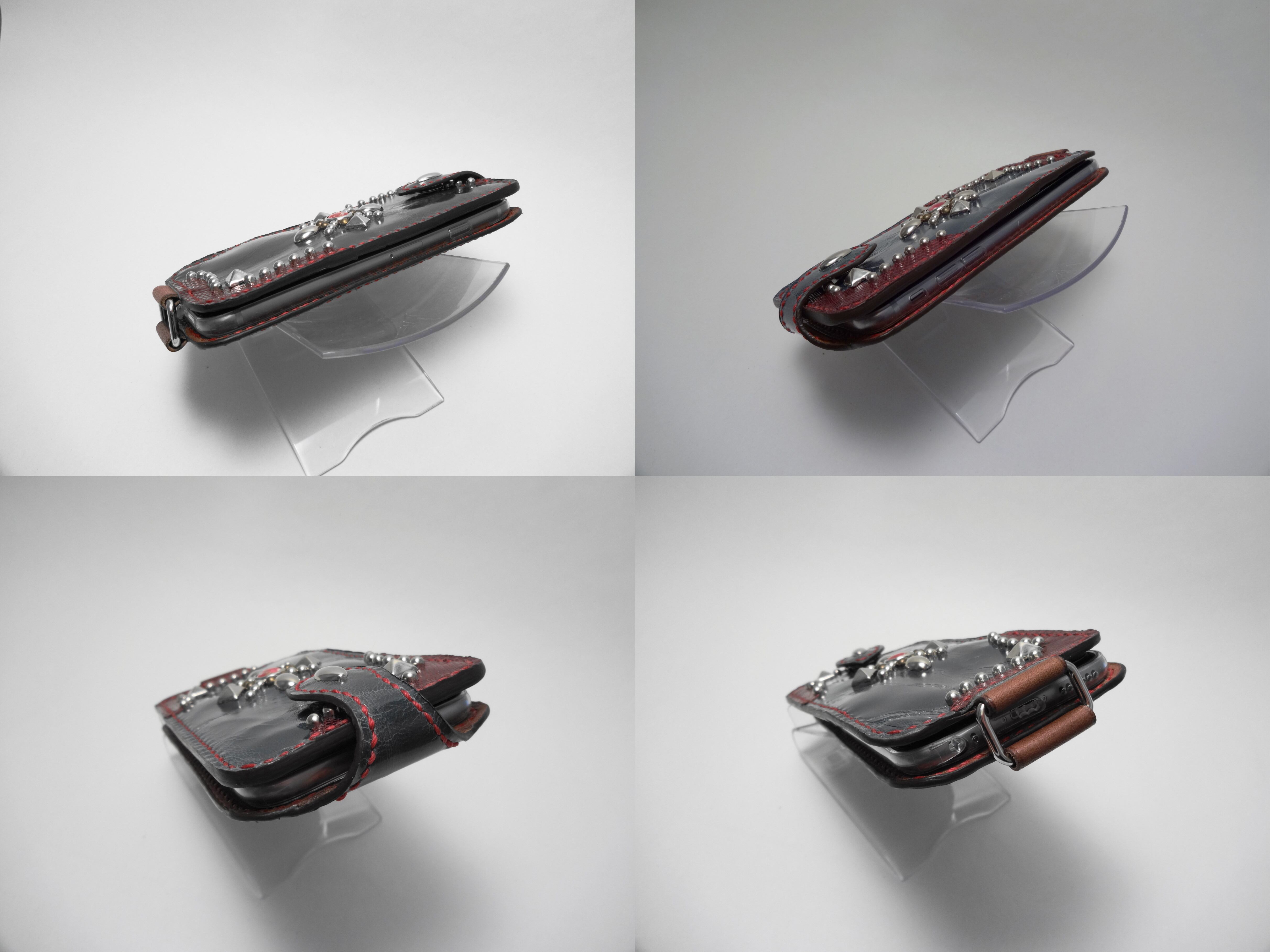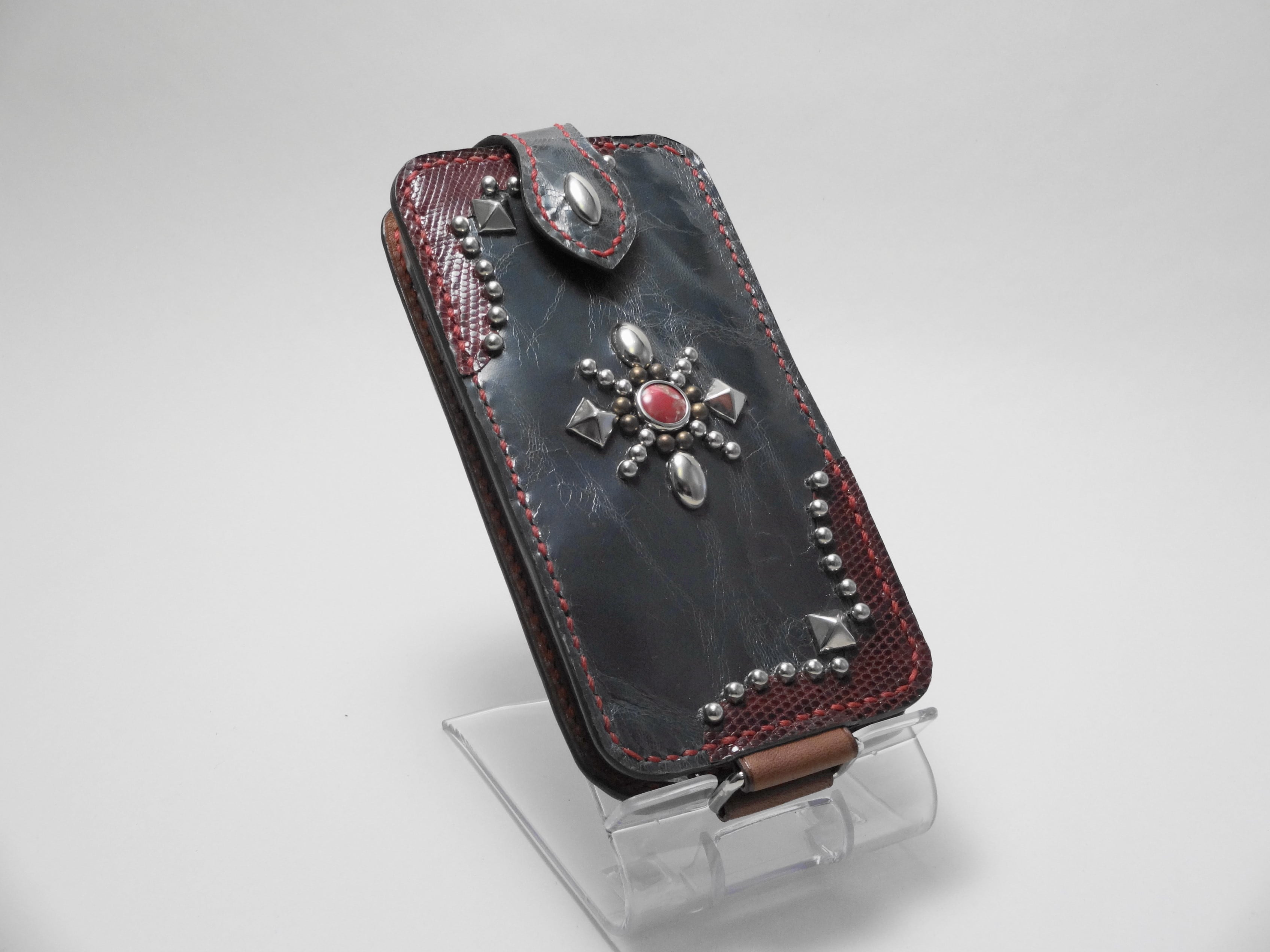 iPhone6用の手帳タイプのケースです。ソフトケースと革を縫い合わせ、縦開きのカバーを付けました。カバーはマグネットで留まり、液晶画面を保護します。また、カバーの内側にはカードが3枚入ります。外側にはスタッズを埋め込み、コーナーをトカゲ革で飾りました。本体とカード入れは角カン金具で繋ぎ、カバーをした状態でもLightningコネクタが差し込める様にしました。また、この角カンにストラップ等が付けられる様になっています。