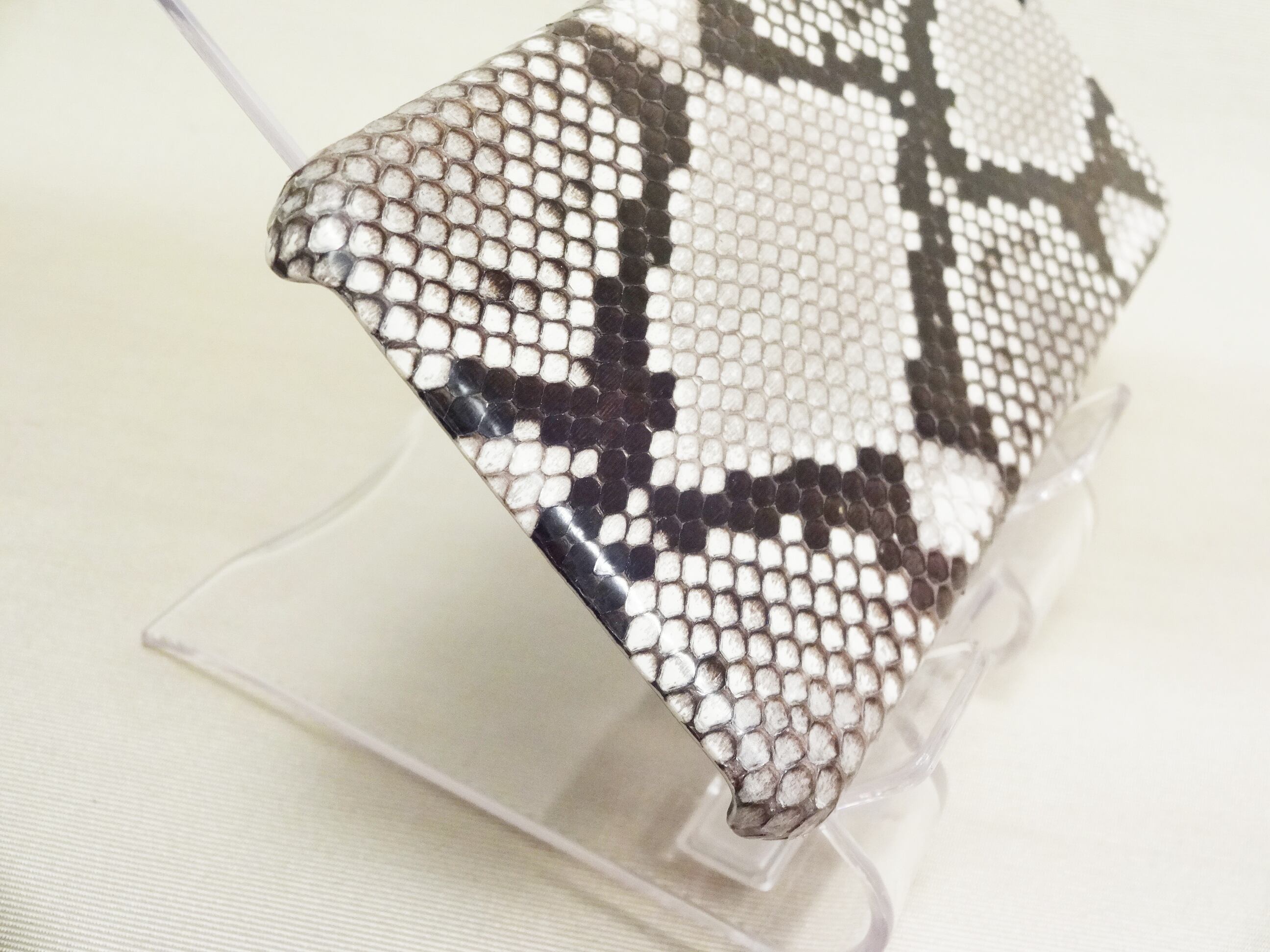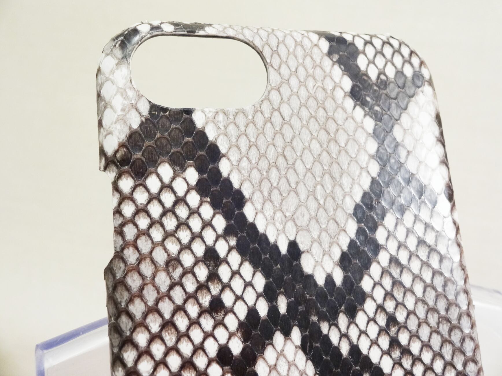 iPhone8,7 用のハードケースです。ヘビ革(ダイヤモンドパイソン)を貼り合わせ、上品なケースに仕上げました。革の裁断切り口とケースとの接続面に、仕上げ塗料を塗る事で、はがれにくく、滑らかな感触に仕上がっています。