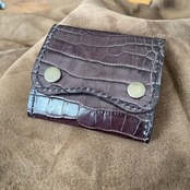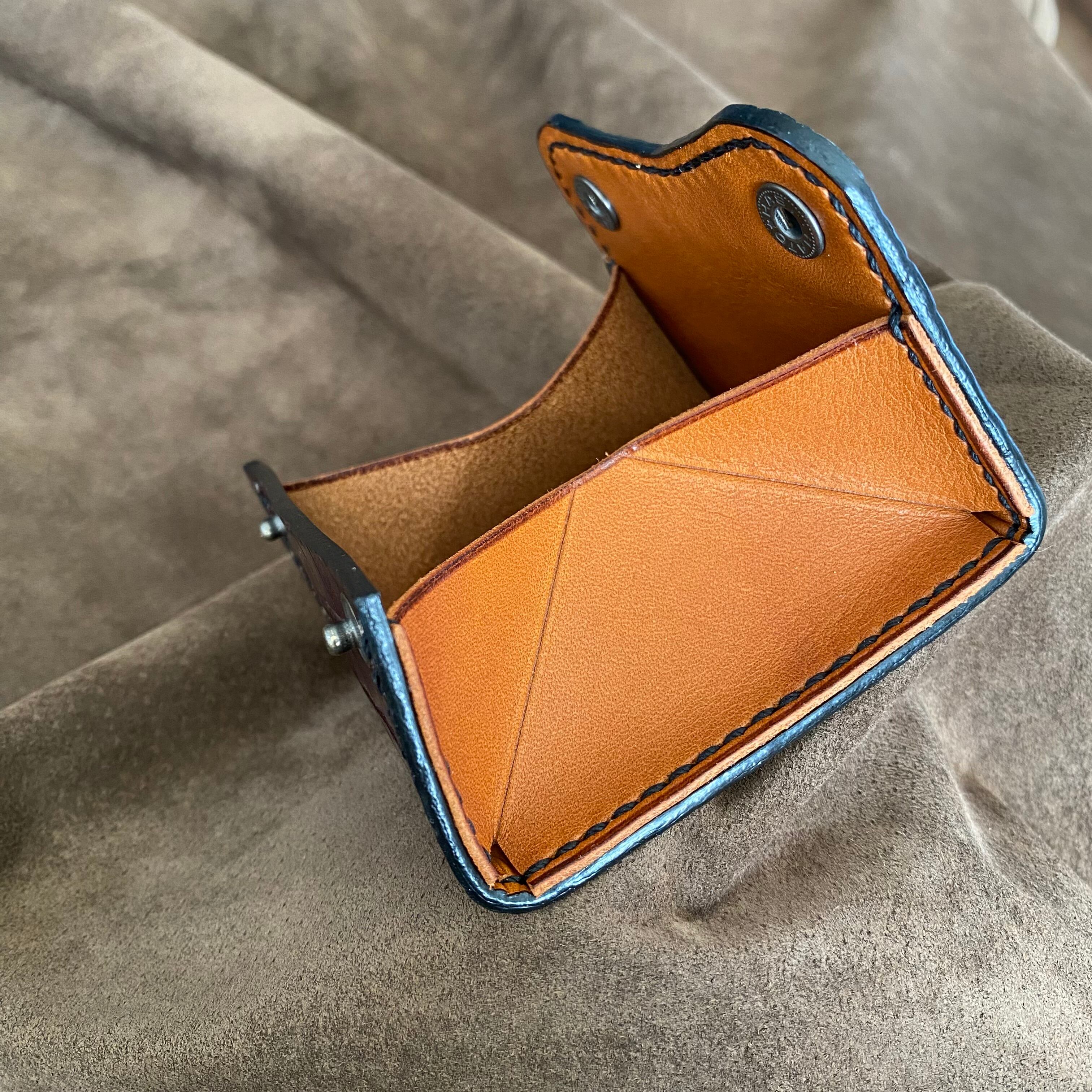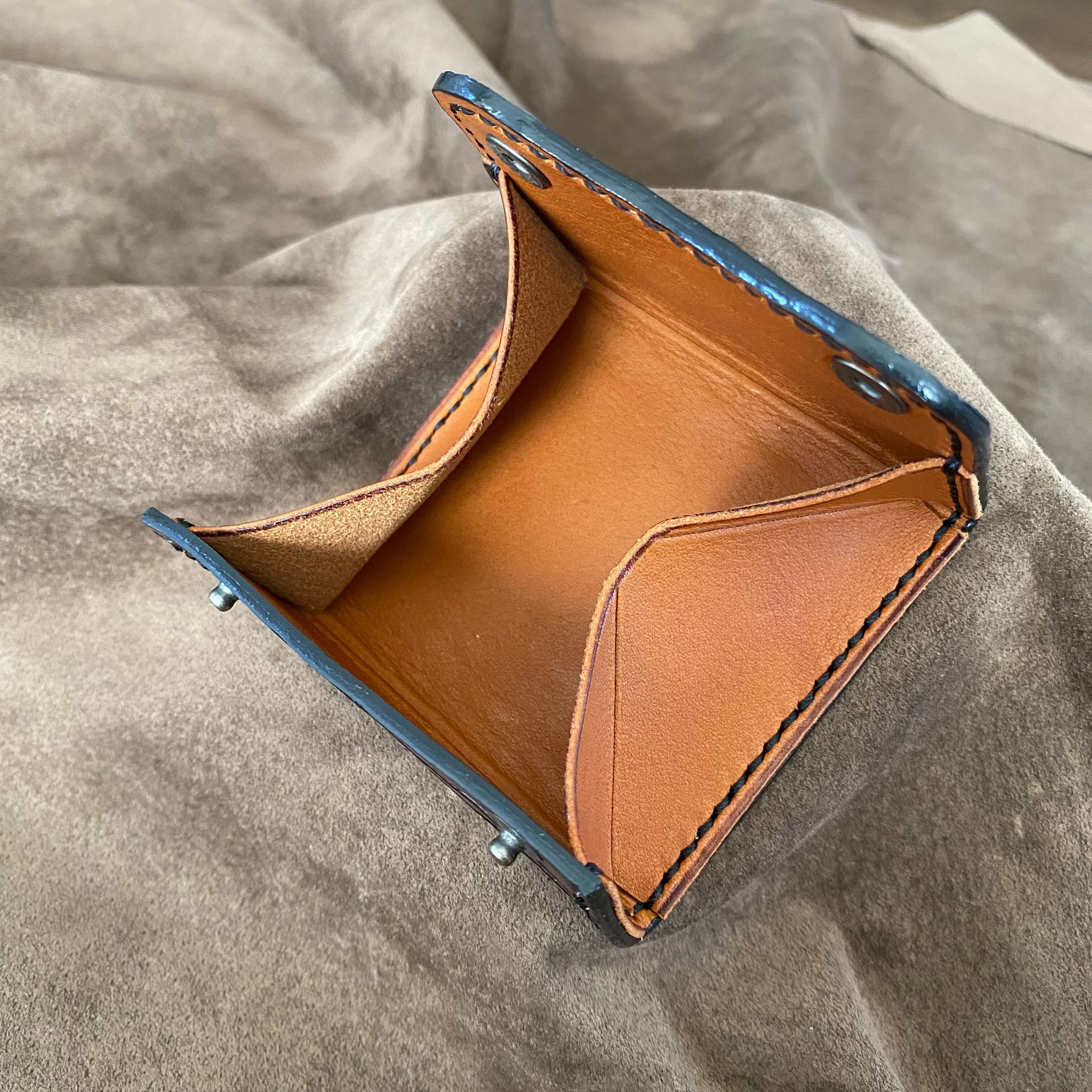 外側には深みのある茄子紺色の牛革、内側には温かみのあるブラウンレザーを採用。縫い糸はブラックで、落ち着いた上品なコントラストが魅力です。