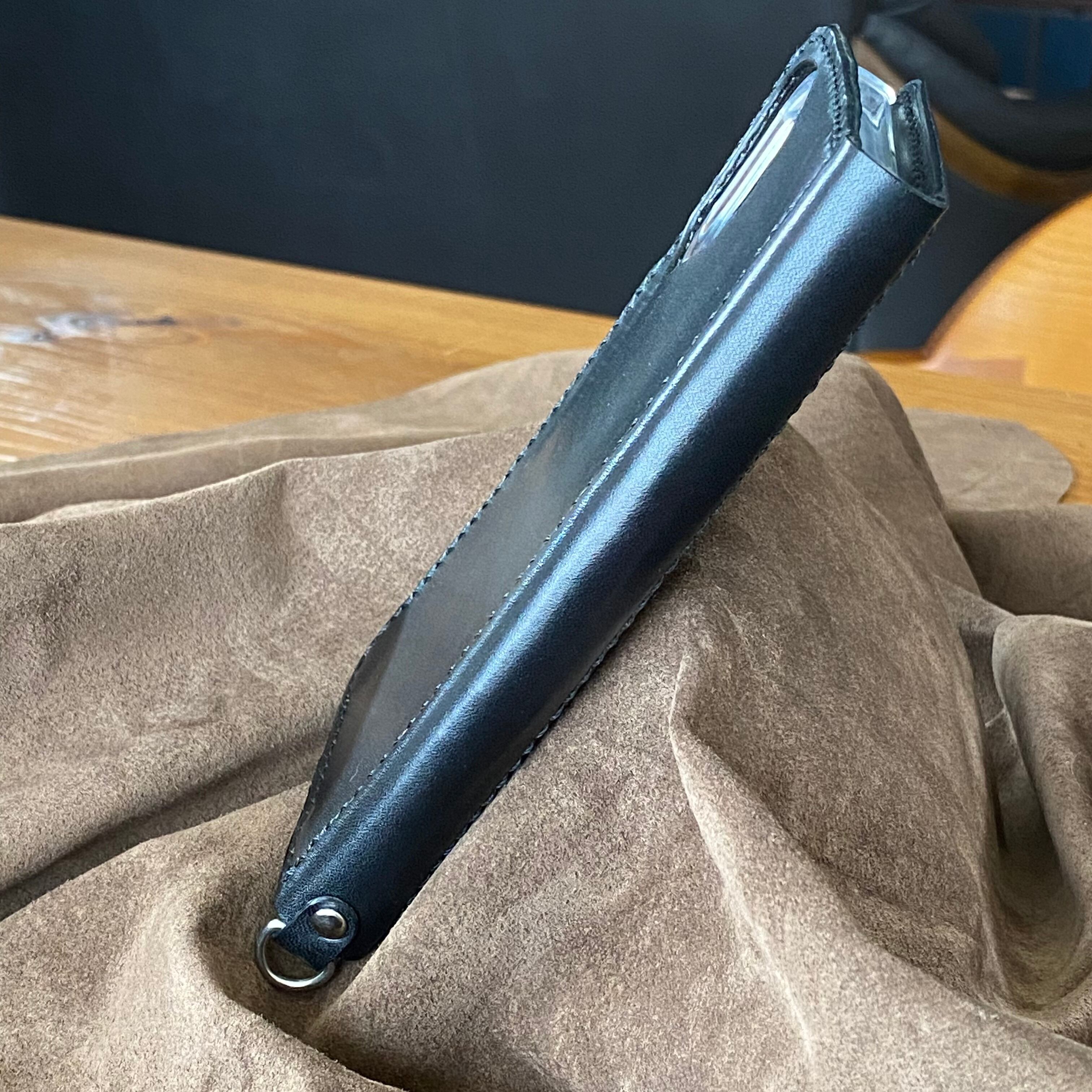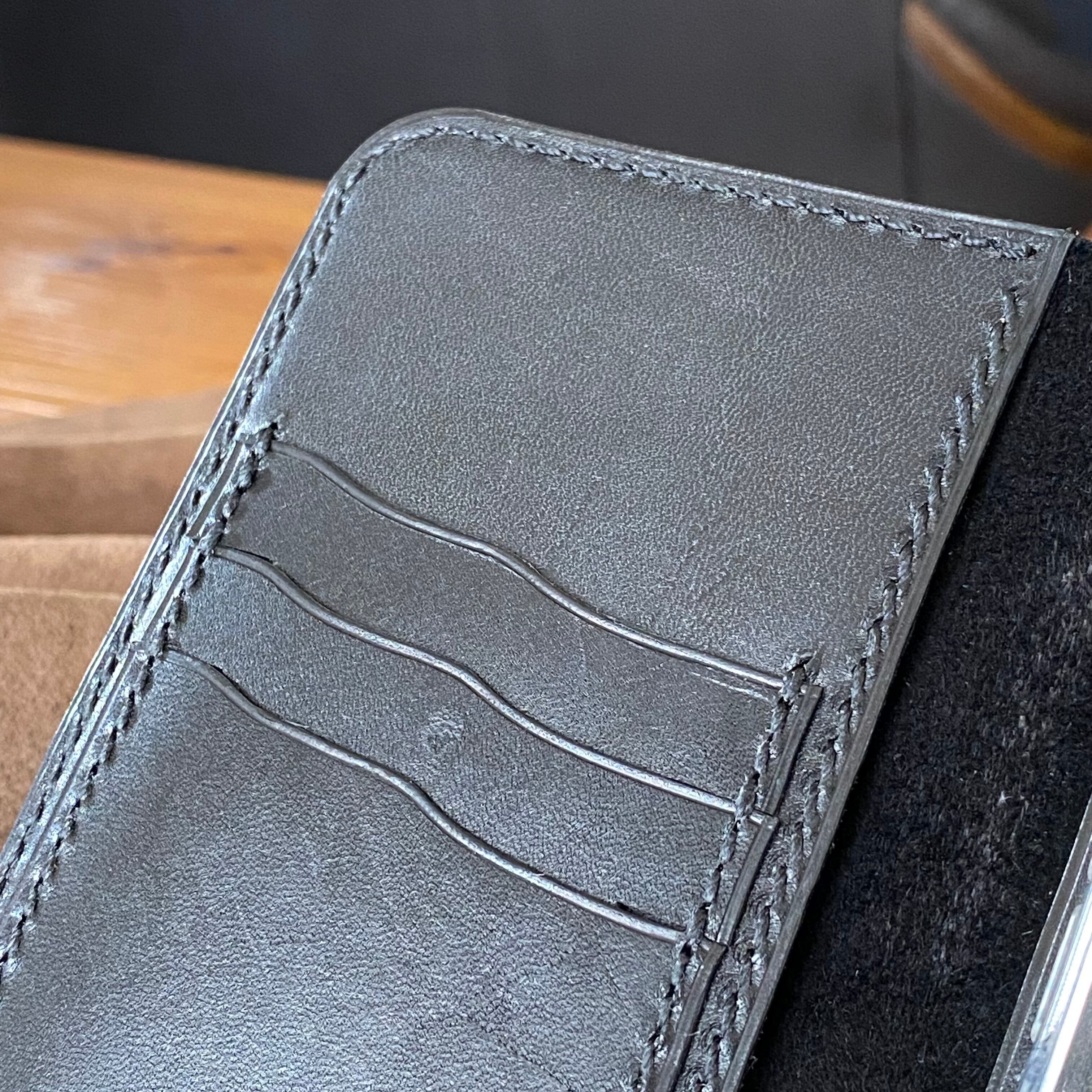 外側・内側ともにブラックの牛革で仕立て、縫製も糸までブラックで統一。シンプルでありながら重厚感をまとい、栃木レザー特有のしっとりとした質感と経年変化をお楽しみいただけます。