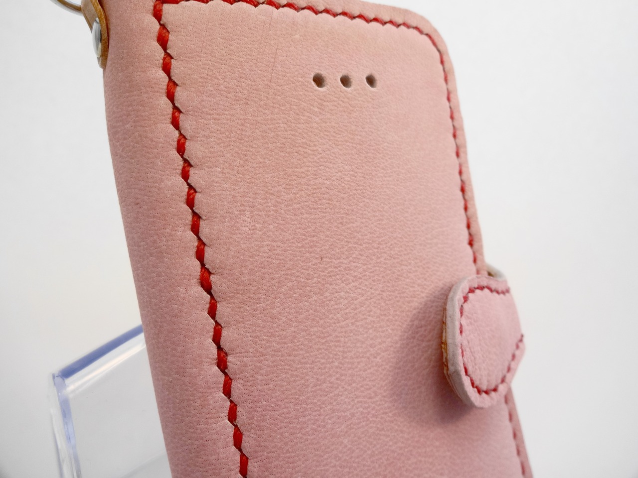 iPhone5C用のソフトケースです。ソフトケースと革を縫い合わせ、横開きのカバーを付けました。カバーはマグネットで留まり、液晶画面を保護します。また、カバーの内側はヌメ革を使い、カードが2枚入る収納を付けました。本体上には、ストラップ等が付けられる様にDカン金具を取り付けました。