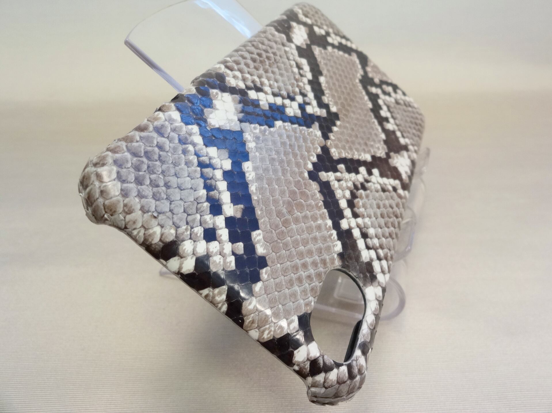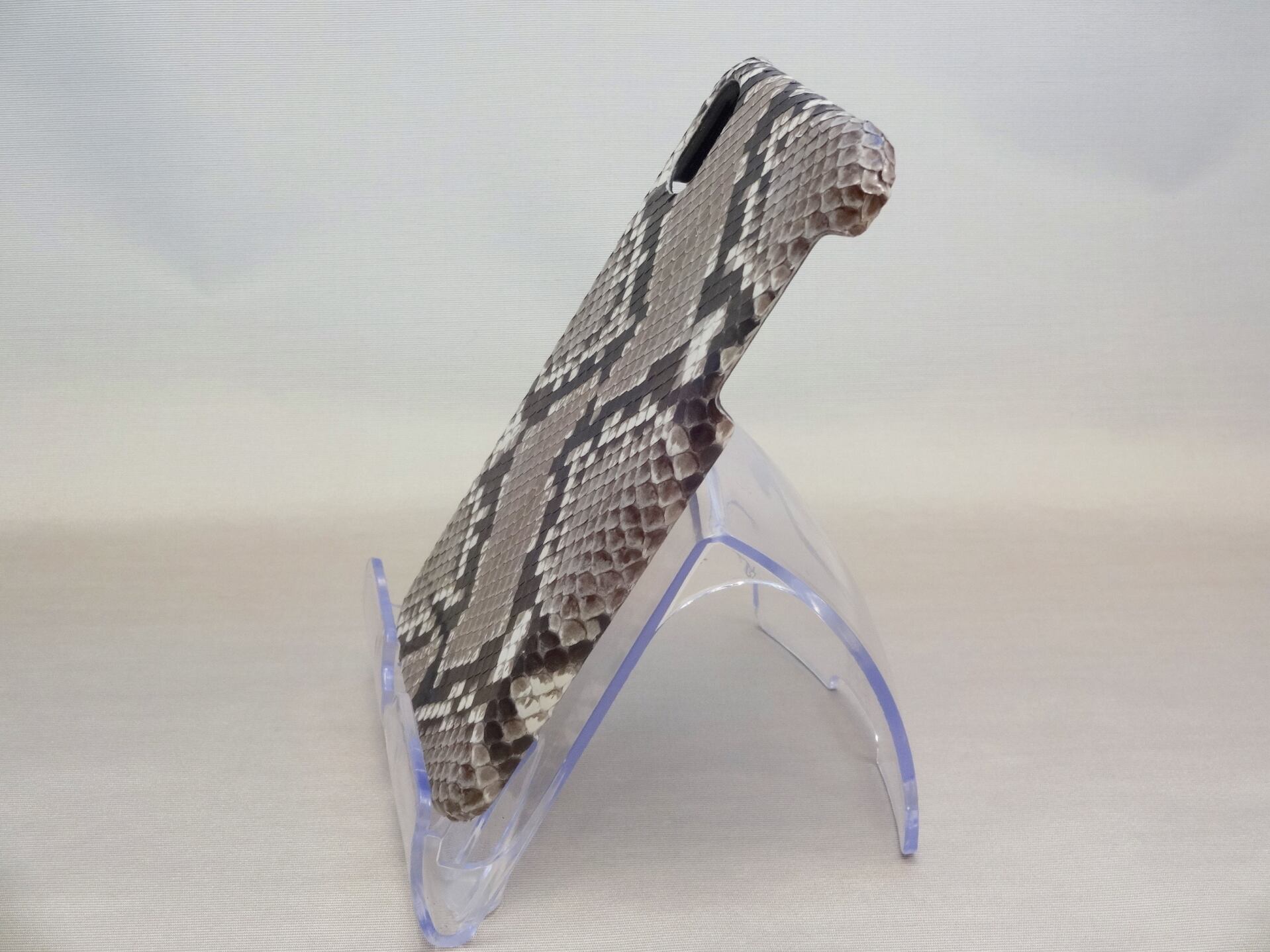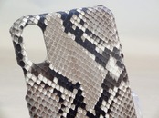 iPhoneXs Max 用のハードケースです。ヘビ革(ダイヤモンドパイソン)を貼り合わせ、上品なケースに仕上げました。革の裁断切り口とケースとの接続面に、仕上げ塗料を塗る事で、はがれにくく、滑らかな感触に仕上がっています。