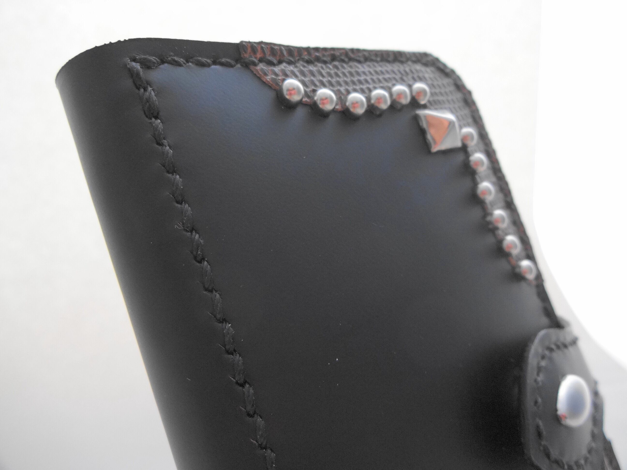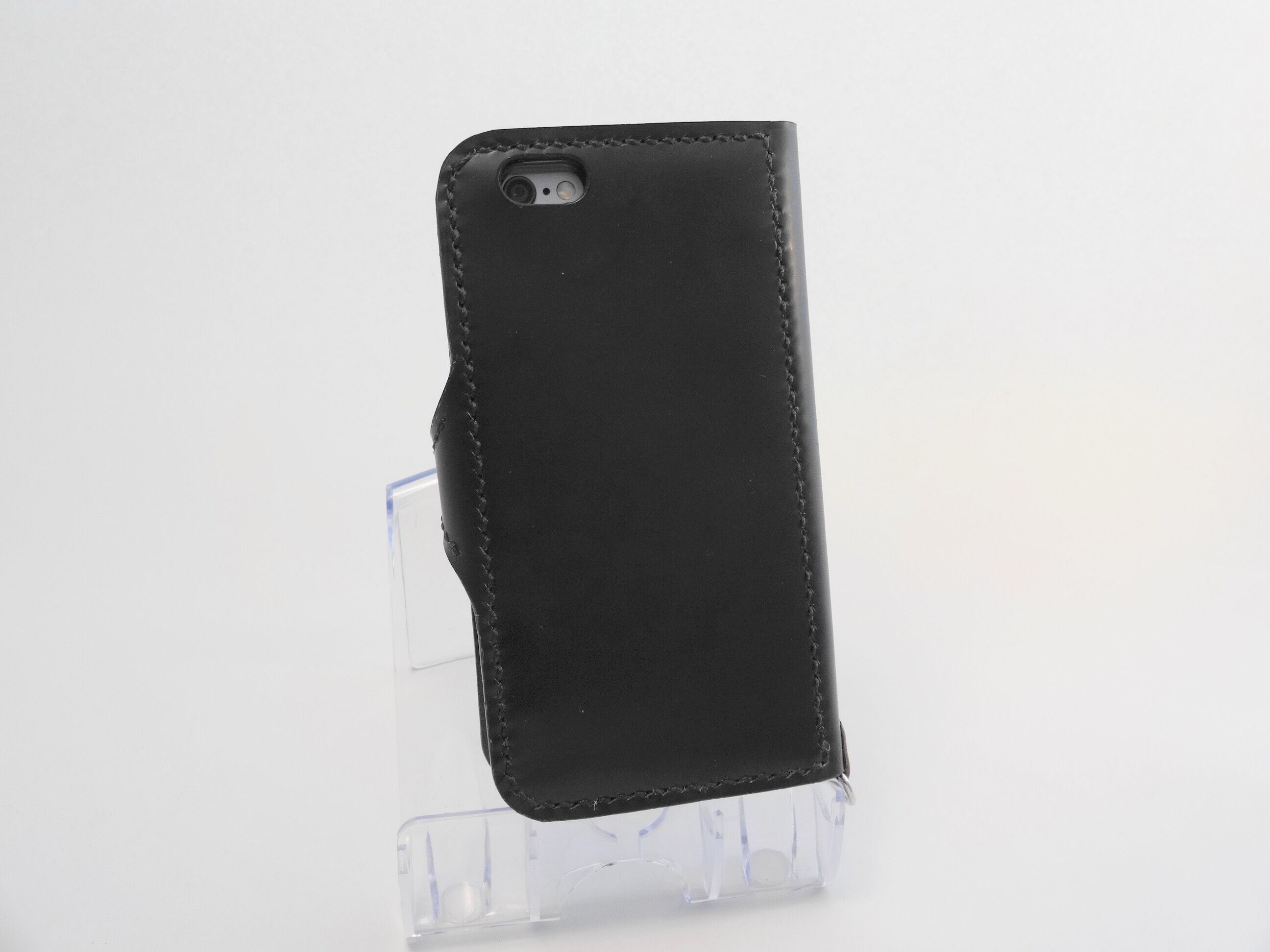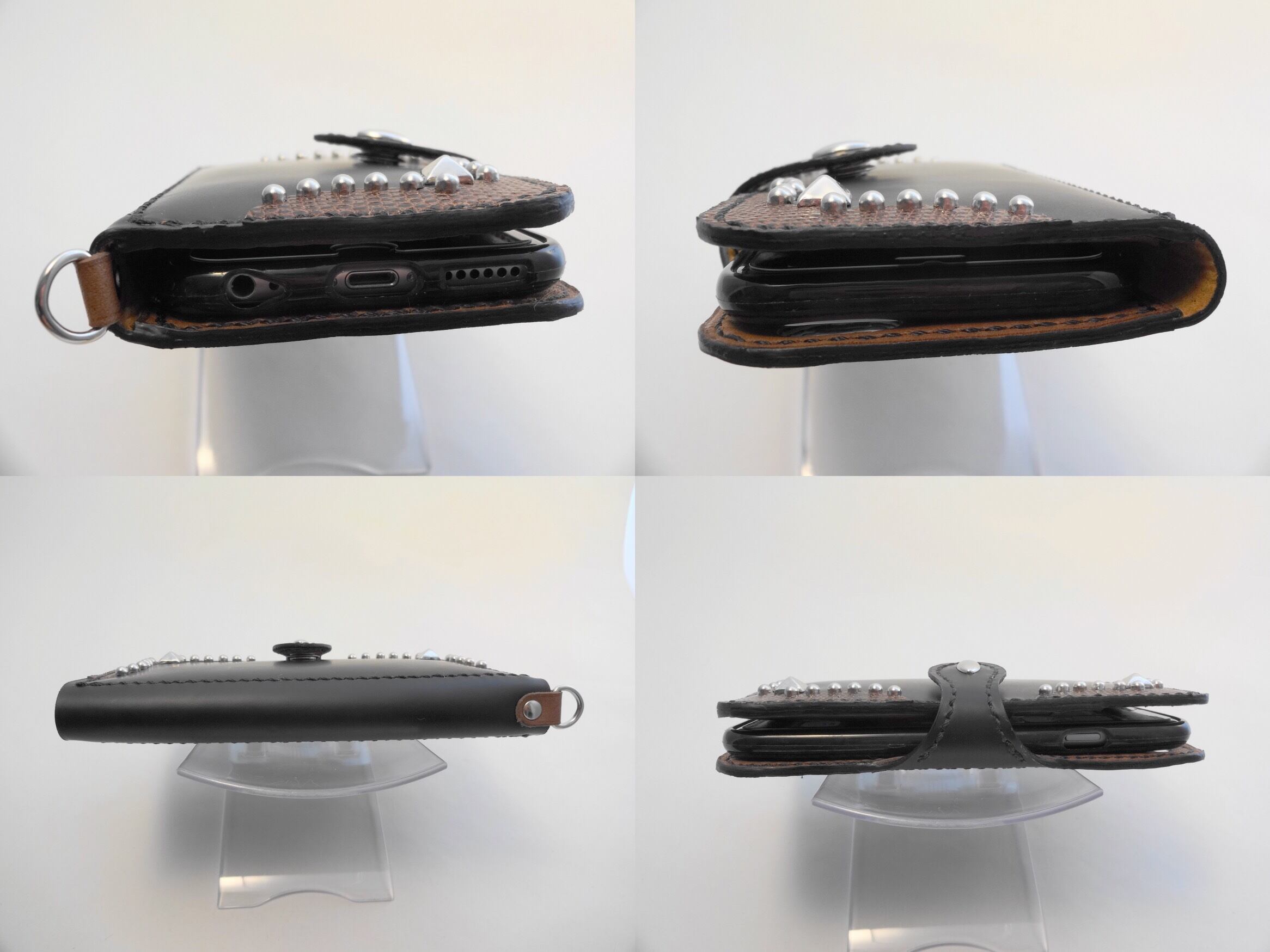 iPhone6用の手帳タイプのケースです。ソフトケースと革を縫い合わせ、横開きのカバーを付けました。カバーはマグネットで留まり、液晶画面を保護します。また、カバーの内側にはカードが3枚入ります。カード入れの裏に収納ポケットを1つ付けました。外側にはスタッズを埋め込み、コーナーをトカゲ革で飾りました。本体下には、ストラップ等が付けられる様にDカン金具を取り付けました。