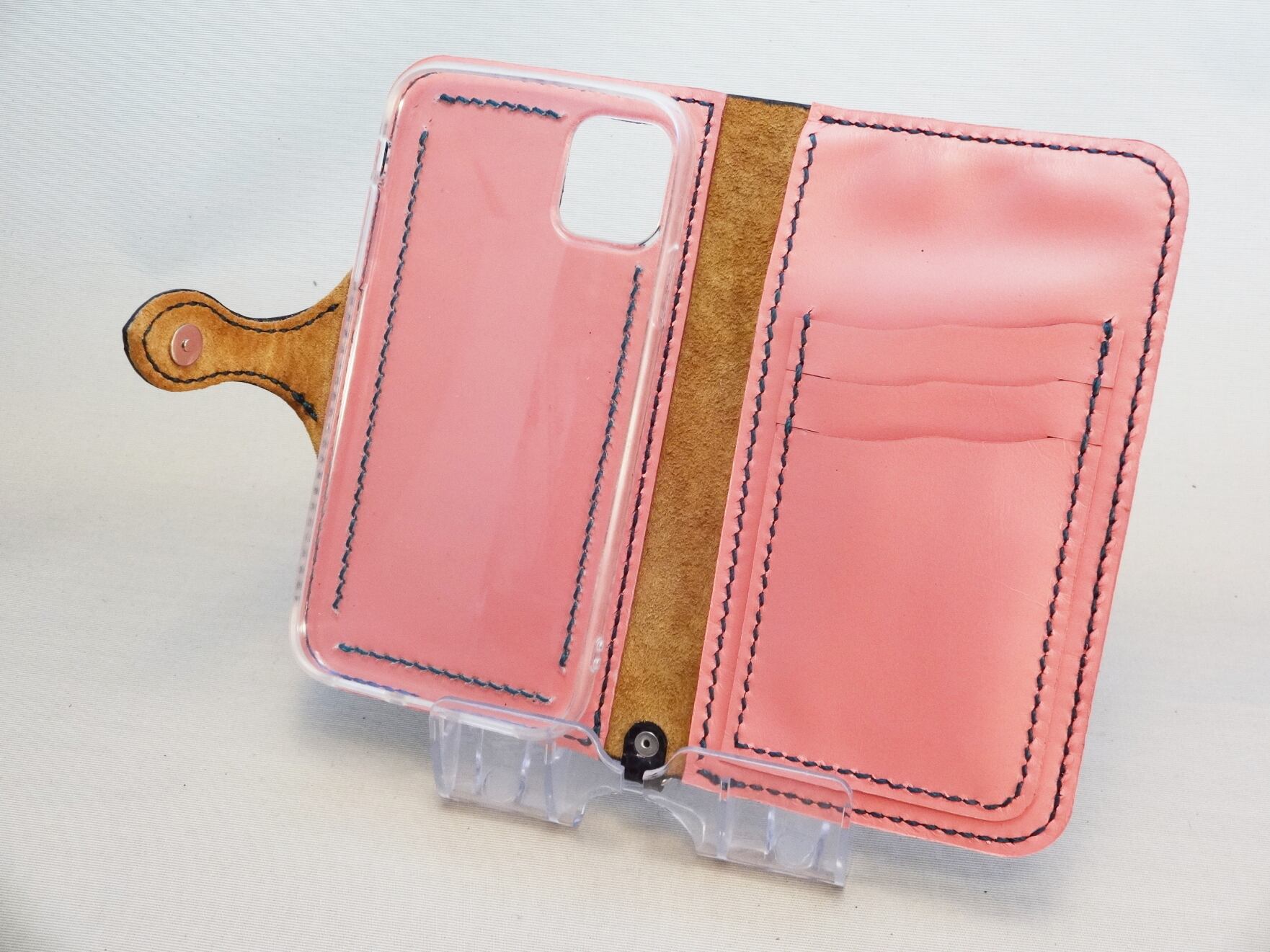 ソフトケースと革を縫い合わせ、横開きのカバーを付けました。