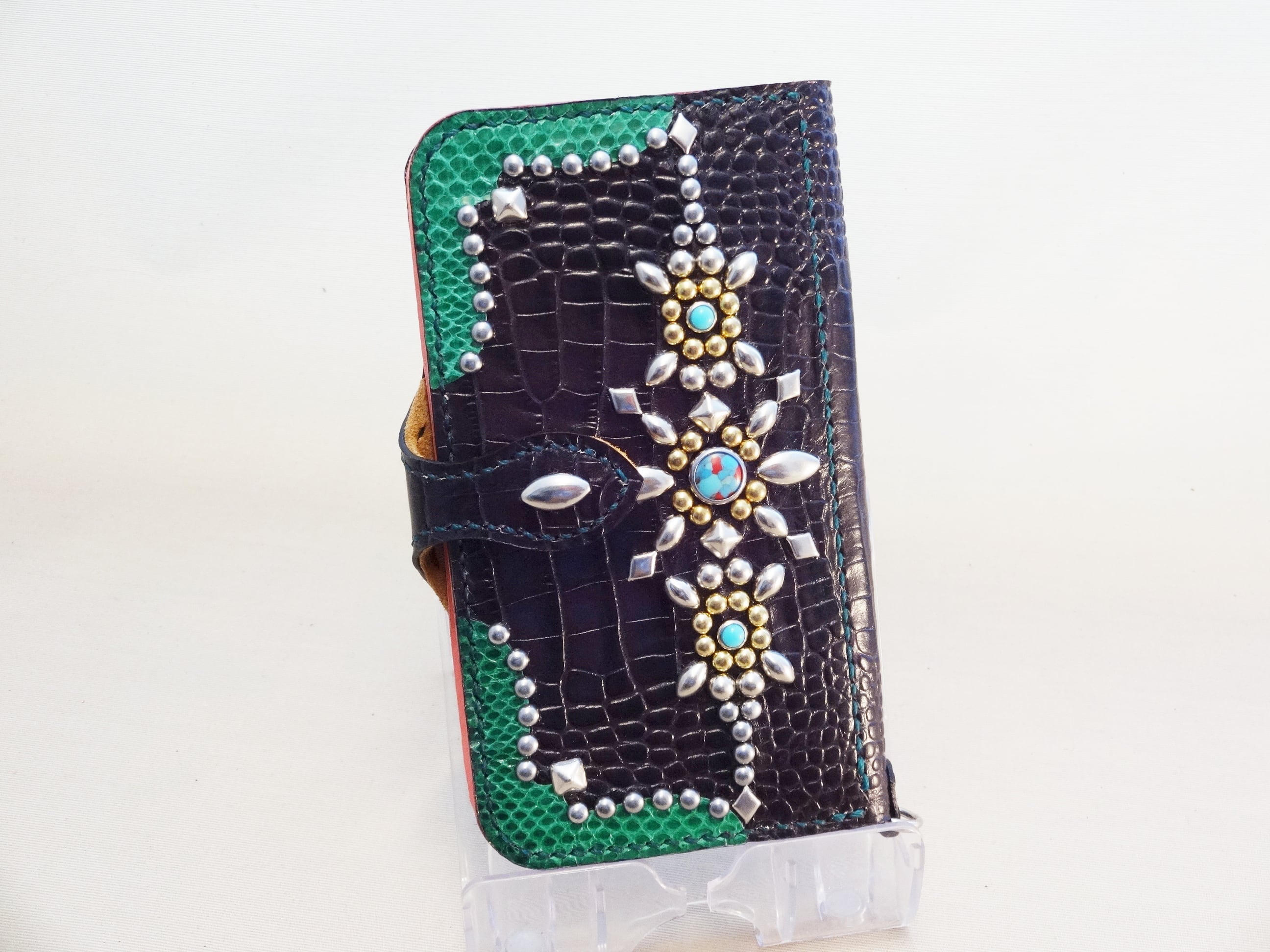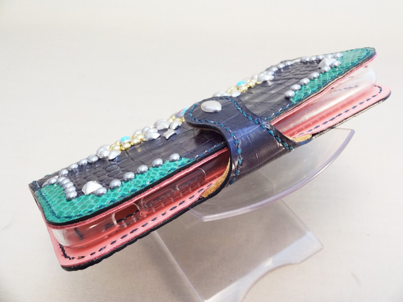 外側にはスタッズを埋め込み、コーナーをヘビ革で飾りました。