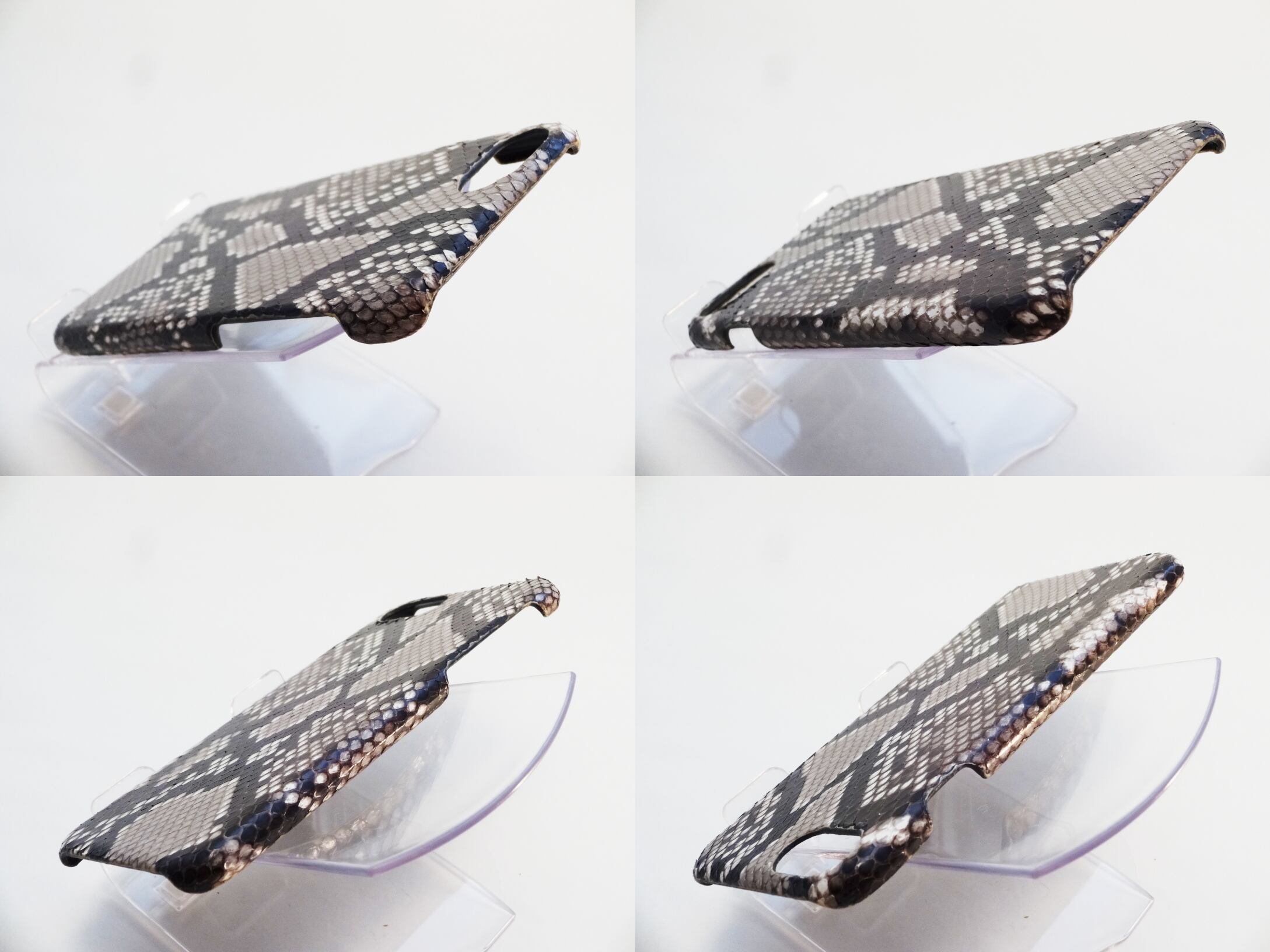 iPhone7 用のハードケースです。ヘビ革(ダイヤモンドパイソン)を貼り合わせ、上品なケースに仕上げました。革の裁断切り口とケースとの接続面に、仕上げ塗料を塗る事で、はがれにくく、滑らかな感触に仕上がっています。