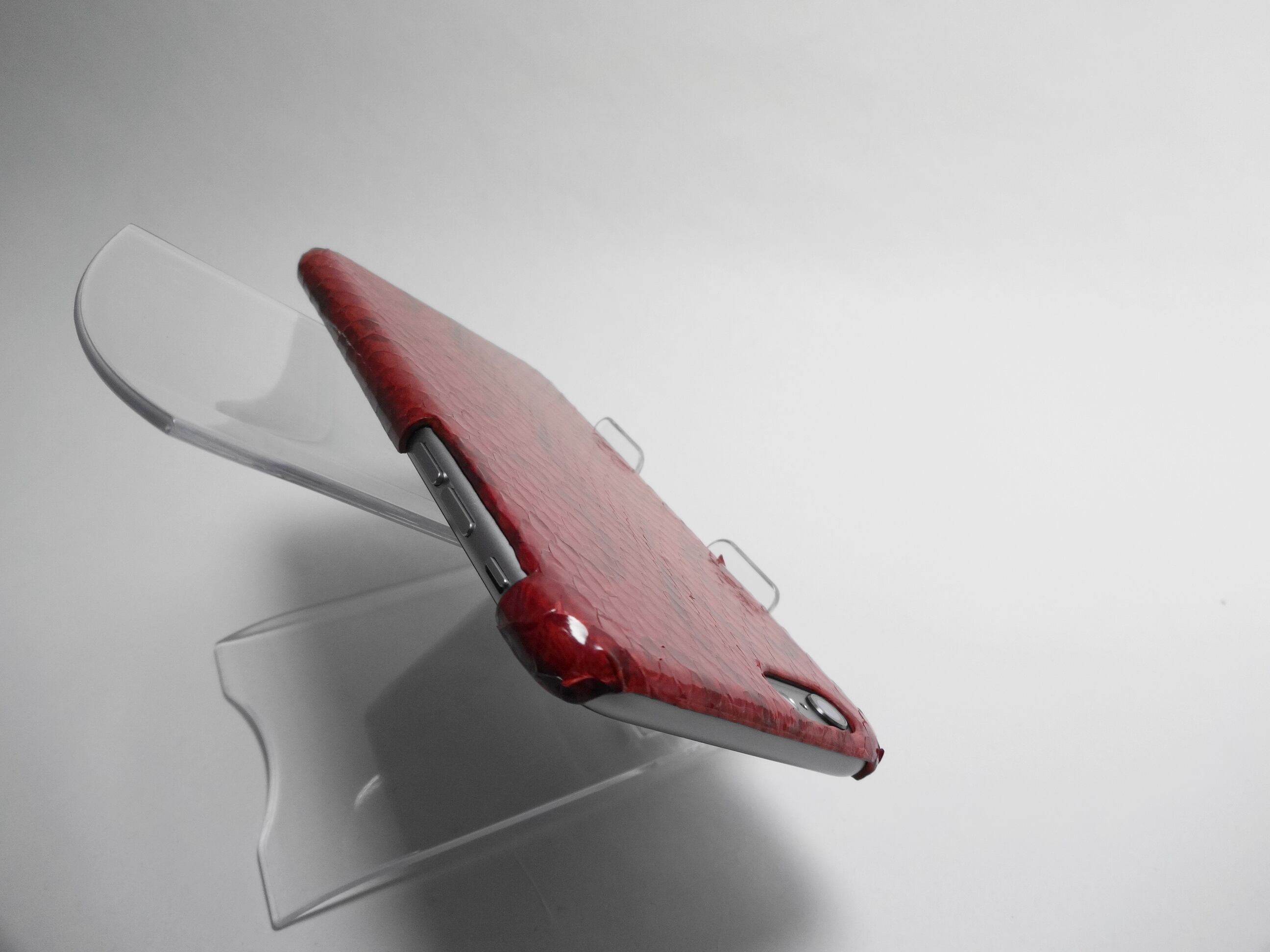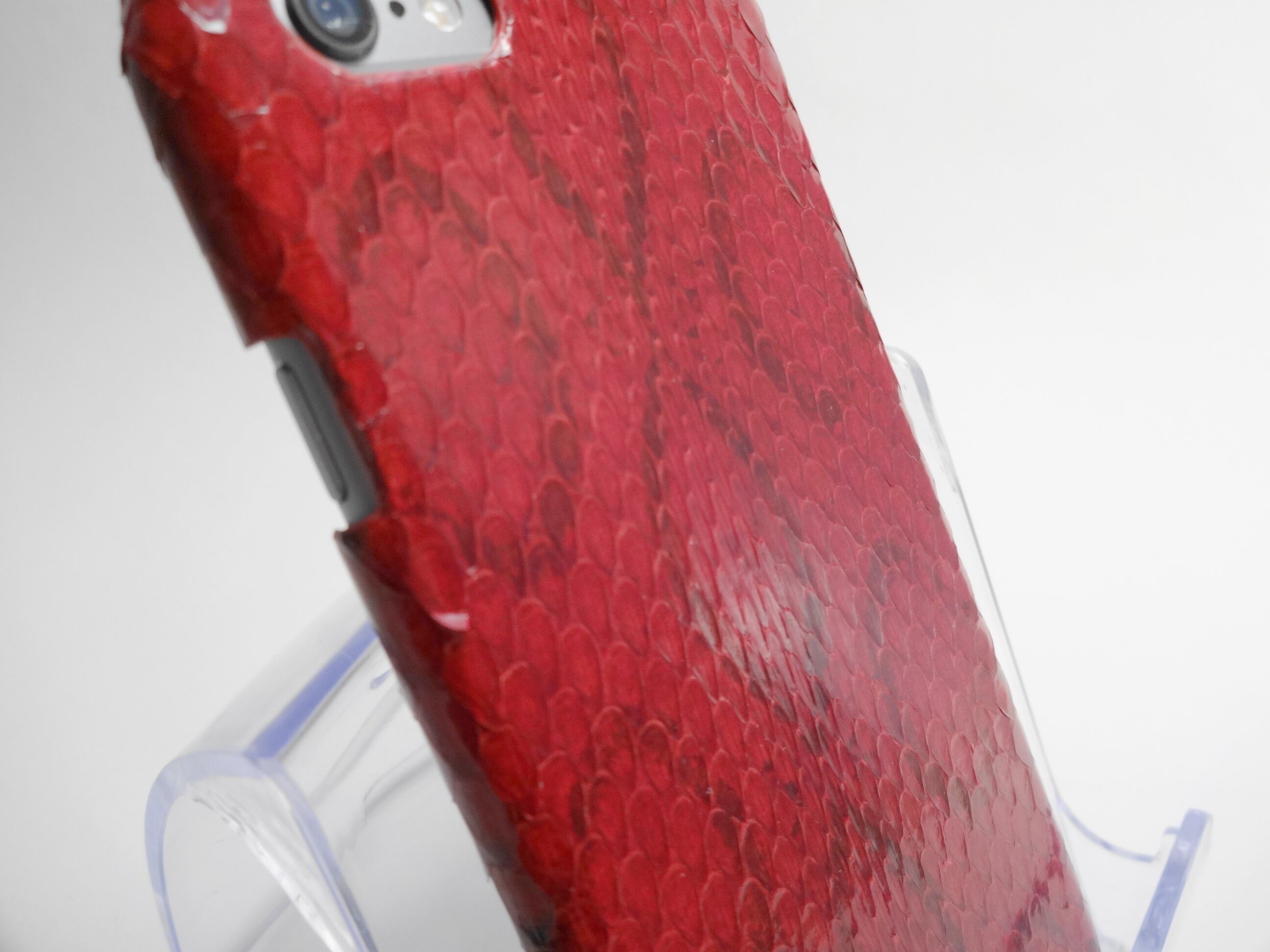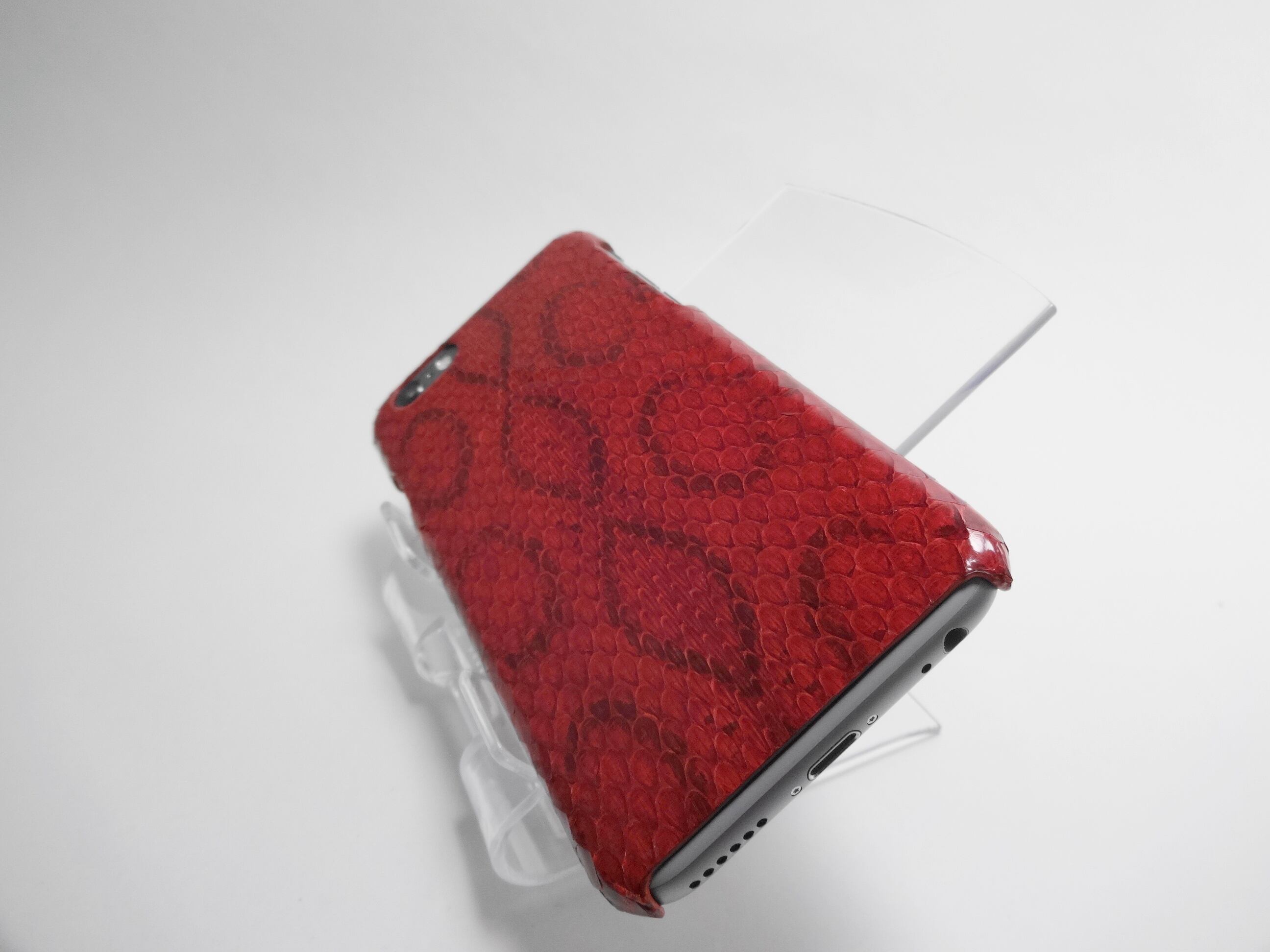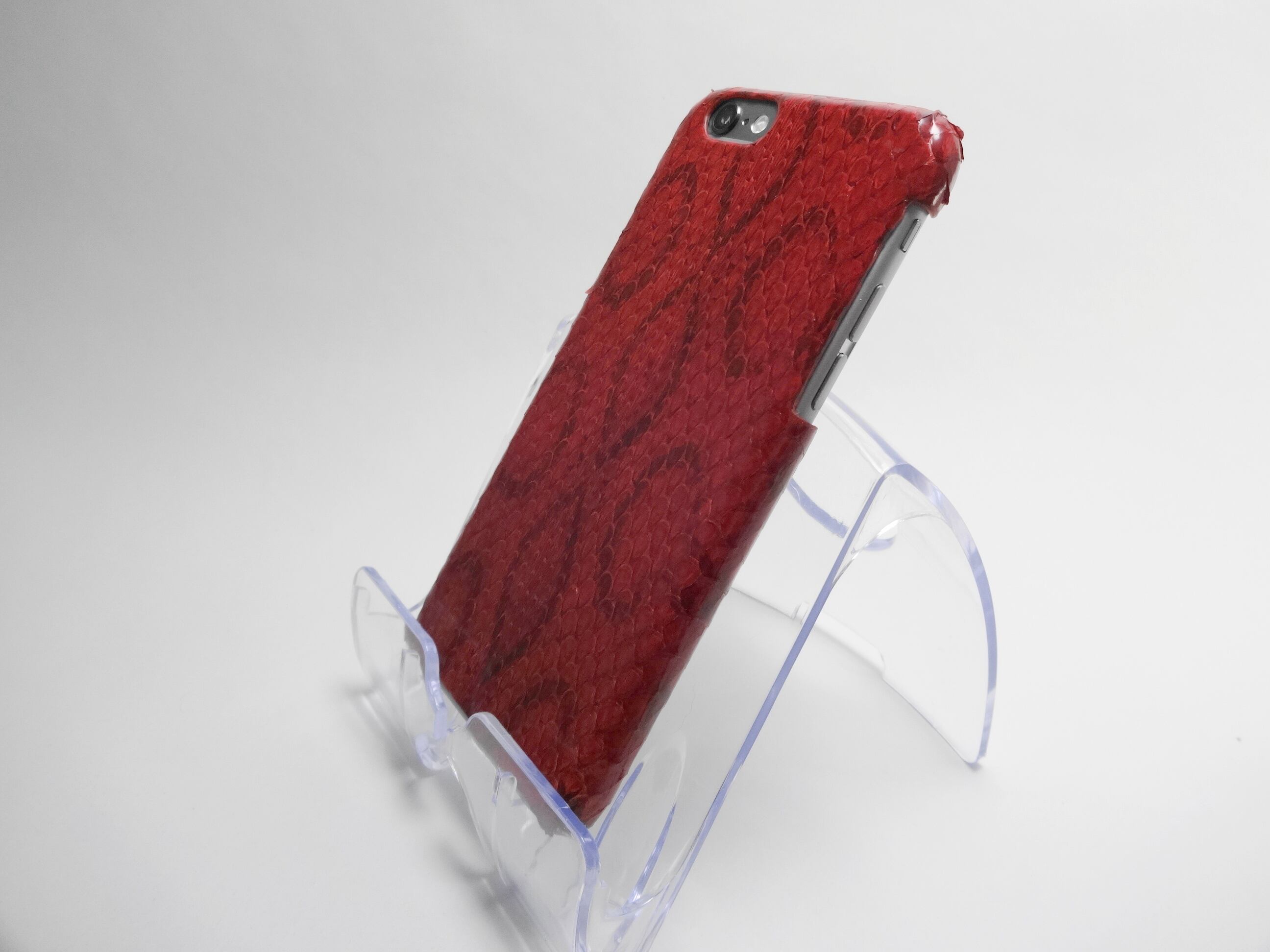 iPhone6用のハードケースです。ヘビ革を貼り合わせ、上品なケースに仕上げました。革の裁断切り口とケースとの接続面に、仕上げ塗料を塗る事で、はがれにくく、滑らかな感触に仕上がっています。