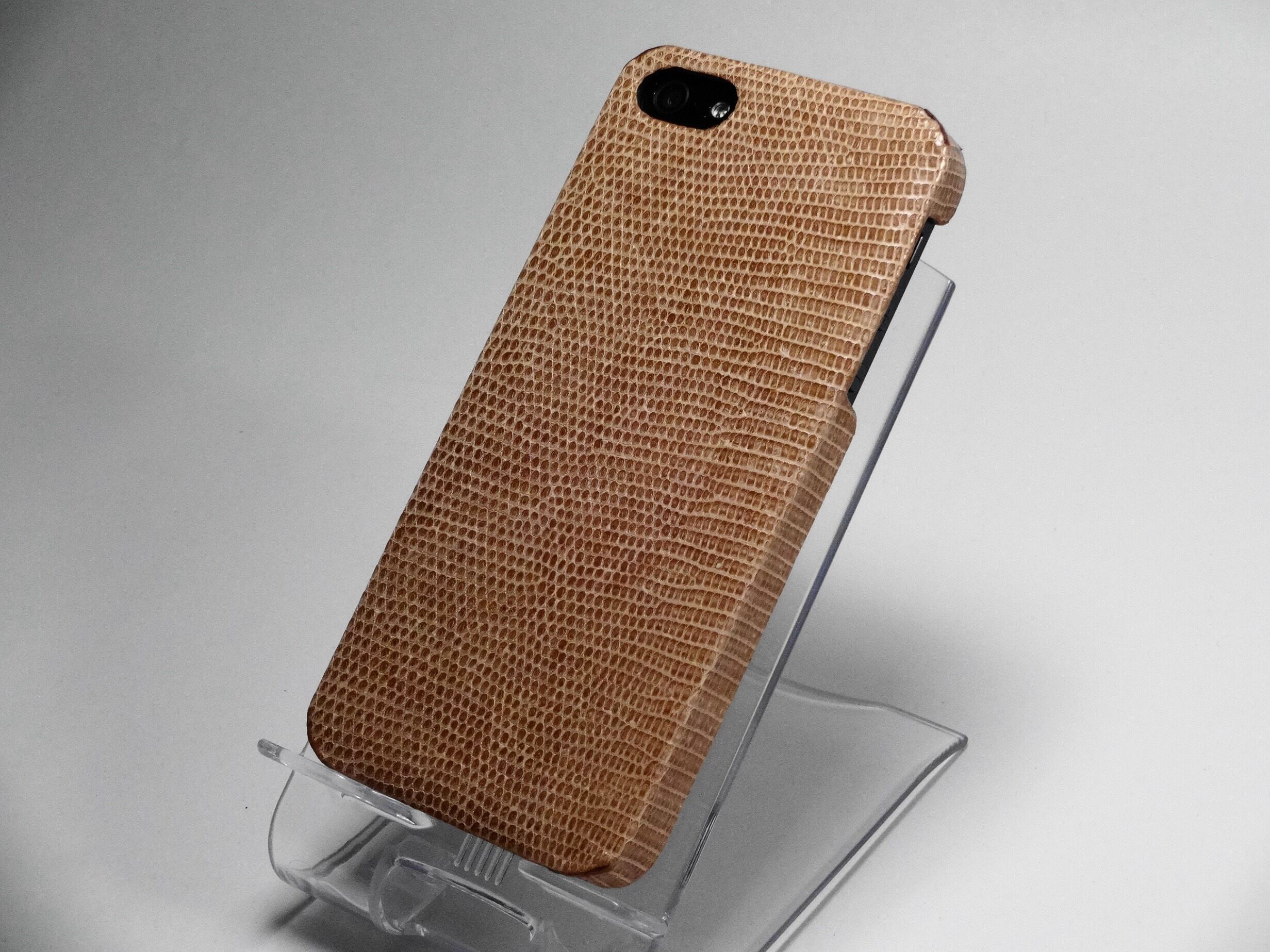 iPhone5,5S用のハードケースです。トカゲ革を貼り合わせ、上品なケースに仕上げました。革の裁断切り口とケースとの接続面に、仕上げ塗料を塗る事で、はがれにくく、滑らかな感触に仕上がっています。