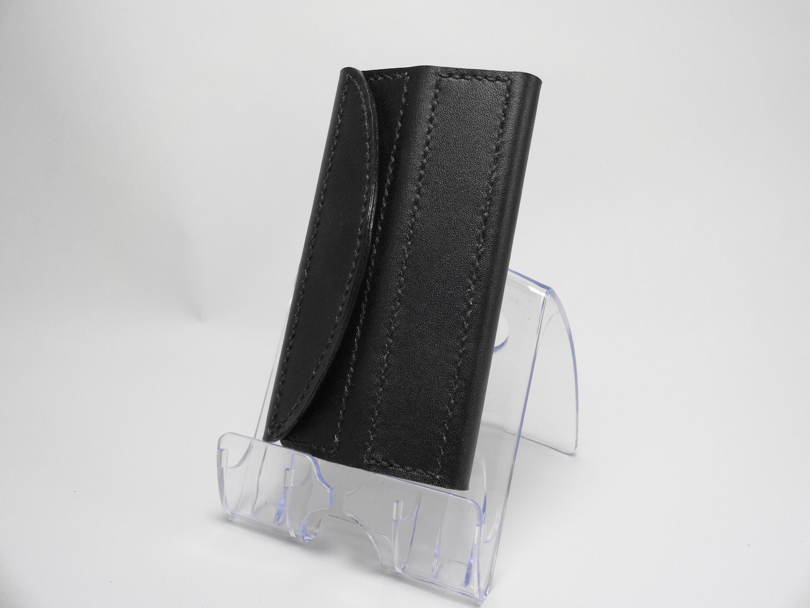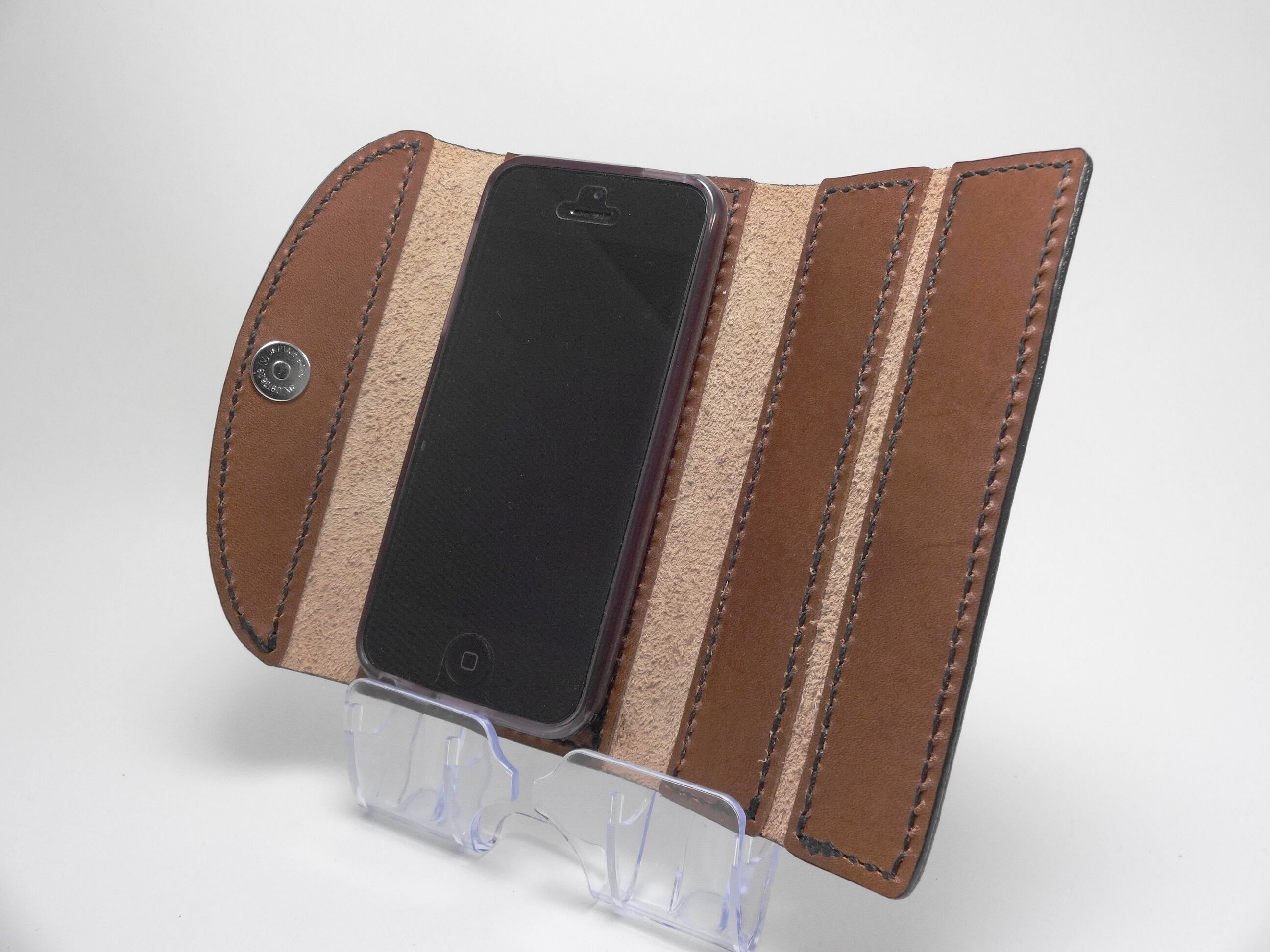 iPhone5,5S,SE用のソフトケースです。ソフトケースと革を縫い合わせ、手帳カバーの様に仕上げました。蓋がマグネットで留まり、液晶画面を保護します。また、反対に折り曲げ、マグネットで固定する事で、スタンドにも早代わり!!外側にはクロスをデザインしたスタッズを埋め込みました。